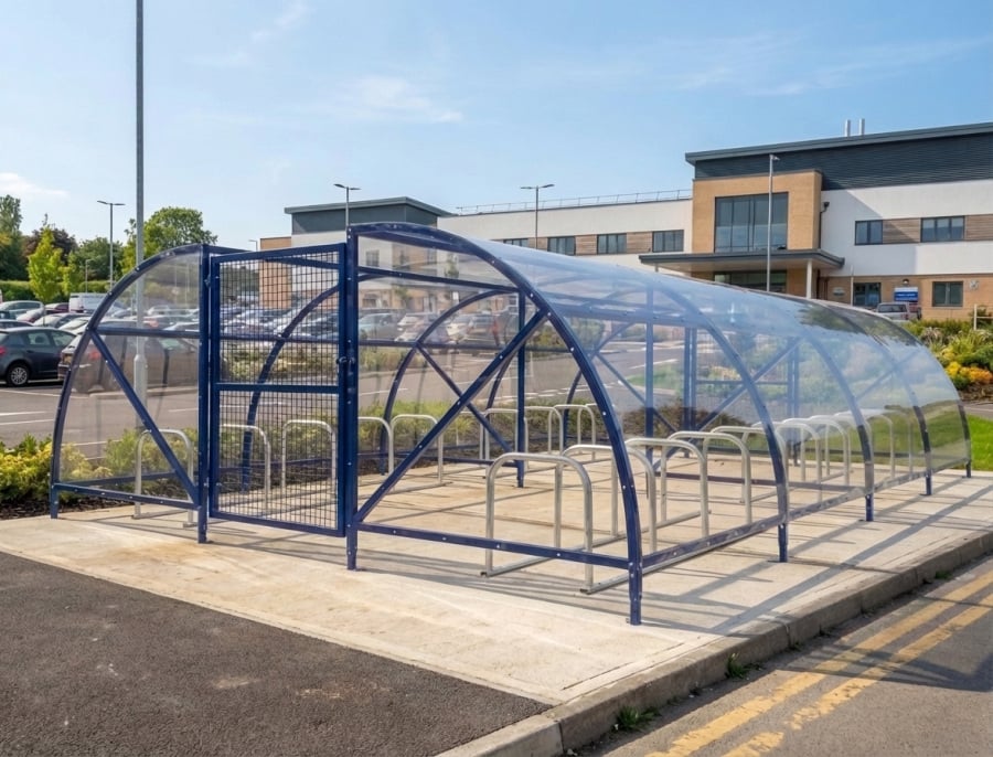 The 40 Space BDS Enclosure and Bike Stands is one of our best-selling large cycle enclosures as it comes with excellent all-around features to suit any environment and is very customisable with many add-on options. The large shelter is made from mild steel and is with bolt-down fixing. The enclosure is available in a galvanised or polyester powder-coated RAL code colour finish. It comes with an anti-vandal clear polycarbonate roof, with optional polycarbonate sides and swing or sliding gates. It is ideally paired with galvanised bike stands, which are the perfect way to provide cyclists with a safe and secure location to store their bikes.
