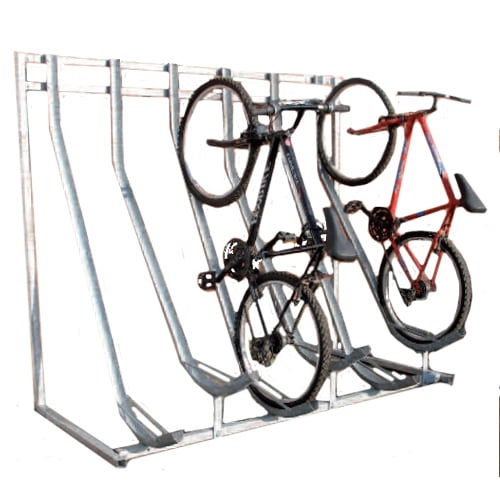 It is VERY space efficient. As the bikes are stored semi vertically (you’ll see what I mean if you look at the photo!) and at staggered heights, the bikes can be stored with only 305mm centre spacing. The staggered heights mean the bikes can be parked closer to each other than other typical racks, which can be quite important in tight places such as under your stairs at home or in the office.